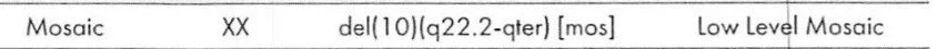 The PGT-A result for the embryo transferred. It shows a low level segmental mosaic result. It is mosaic for a deletion involving chromosome 10.